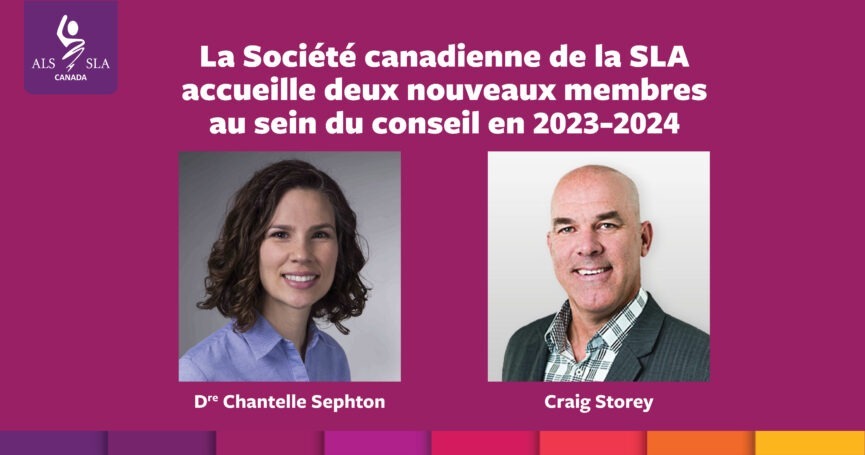 La Société canadienne de la SLA est heureuse d’accueillir la Dre Chantelle F. Sephton, du Québec, et Craig Storey, de l’Île-du-Prince-Édouard, au sein de son conseil d’administration. Le conseil d’administration de la Société canadienne de la SLA est composé de bénévoles de divers horizons qui se sont réunis dans le but commun de s’assurer que la Société soit bien gérée et à ce que l’argent des donateurs soit utilisé au mieux pour servir notre objectif caritatif.