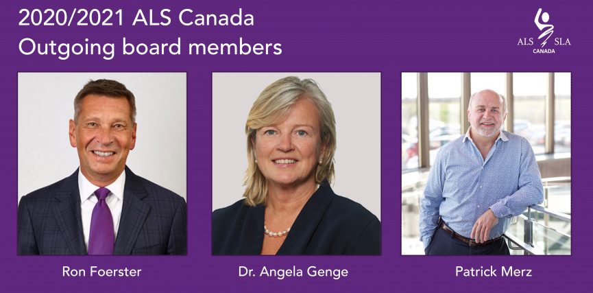 C’est avec une grande reconnaissance que la Société canadienne de la SLA reconnaît la contribution considérable des trois membres du conseil dont le mandat a pris fin, sans pour autant que leur engagement envers la cause de la SLA s’atténue. Merci à M. Ron Foerster, à Dre Angela Genge et à M. Patrick Merz pour vos dons de leadership, de temps et d’expertise.