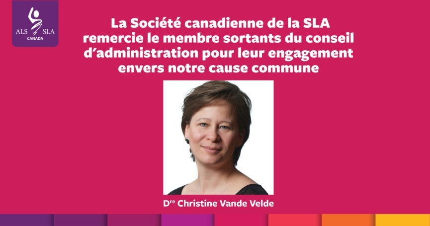 C’est avec admiration et gratitude que la Société canadienne de la SLA souligne l’incroyable contribution de la Dre Christine Vande Velde, dont le mandat de membre de son conseil d’administration est arrivé à terme.