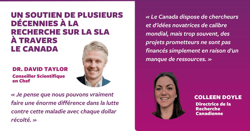 Dave: Tout à fait. La recherche sur la SLA est sous-financée ici au Canada, et nous voulons nous assurer que les dons des donateurs sont utilisés de manière optimale. Je pense que nous pouvons vraiment faire une énorme différence dans la lutte contre cette maladie avec chaque dollar récolté. Nous sommes convaincus que des fonds supplémentaires nous aideront à accélérer l’avènement d’un monde sans SLA.