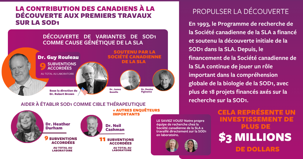 En parallèle aux efforts mondiaux, les chercheurs canadiens ont joué un rôle important dans la confirmation du rôle toxique de la SOD1 dans la SLA et dans l’approfondissement des connaissances sur sa pathologie. Ce travail collectif a ouvert la voie à une stratégie thérapeutique visant directement à réduire la SOD1. Les connaissances acquises sur le gène SOD1 ont également contribué à la compréhension de toutes les formes de SLA, les modèles génétiques ayant considérablement amélioré notre compréhension de la maladie et le développement de cibles thérapeutiques.